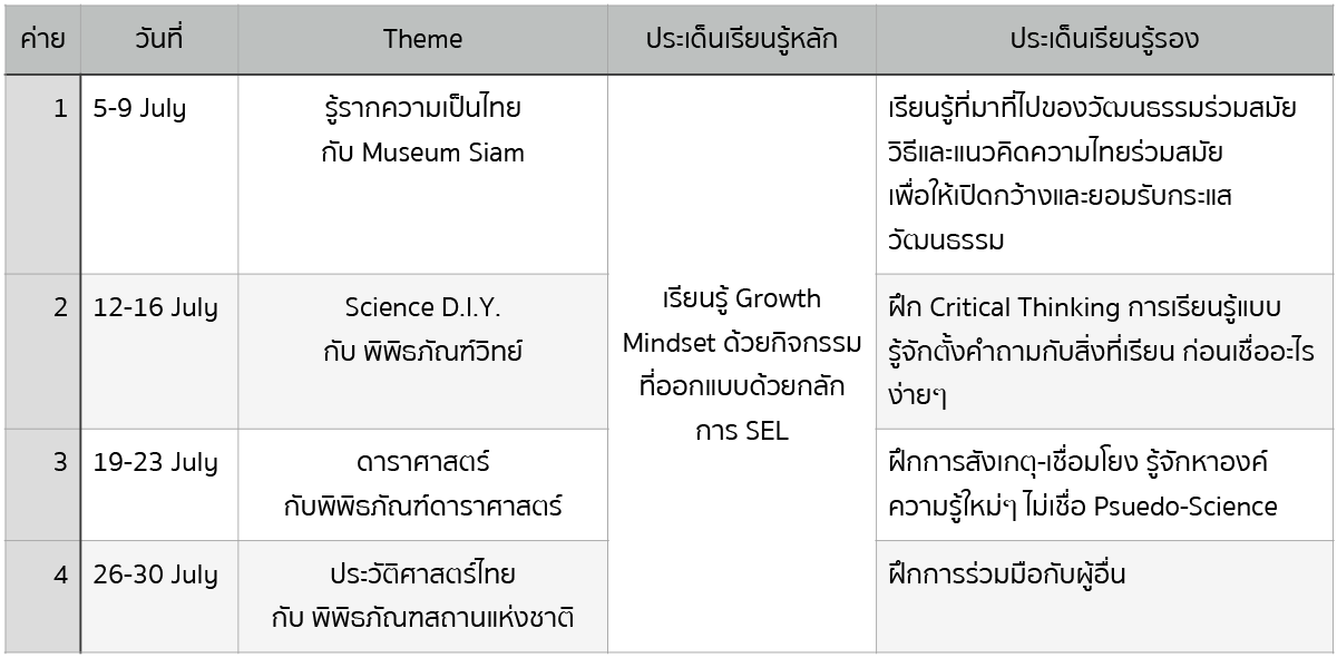 Theme ค่ายจะมีต่างกัน การเรียนรู้และกิจกรรมแต่ละค่ายจะต่างกัน